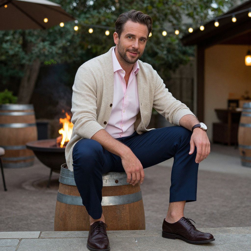 A man, striped dress shirt in navy and white, khaki chinos, dark brown leather oxfords, burgundy lightweight sweater, tailored fit, cozy library nook, plush seating, floor-to-ceiling bookshelves, ektachrome film stock, thoughtful expression. Man has masculine face and piercing eyes