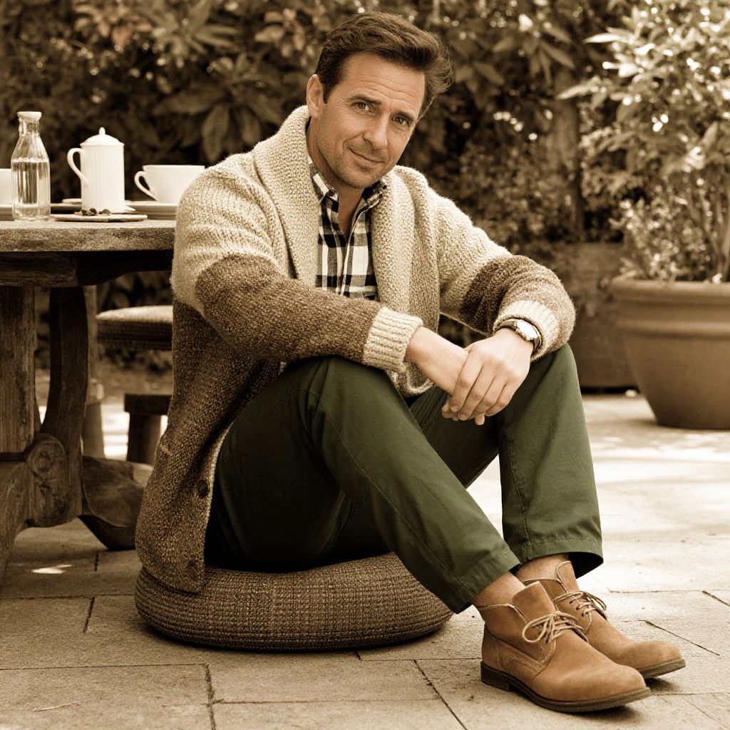 Photograph of a Caucasian man with short, dark brown hair, sitting on a brown cushioned bench in a library. He is wearing a dark brown sweater with white striped collars and cuffs, beige pants, black socks, and dark brown leather shoes. He has a contemplative expression, with his right hand touching his chin. Behind him, wooden bookshelves filled with various books create a cozy, scholarly atmosphere. The carpet beneath the bench is gray. The lighting is soft, highlighting the man's thoughtful demeanor. The overall style is casual yet intellectual.