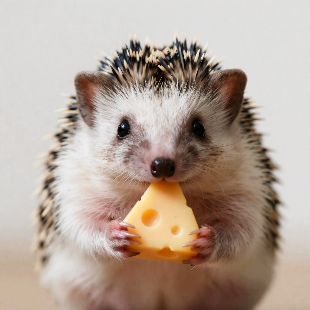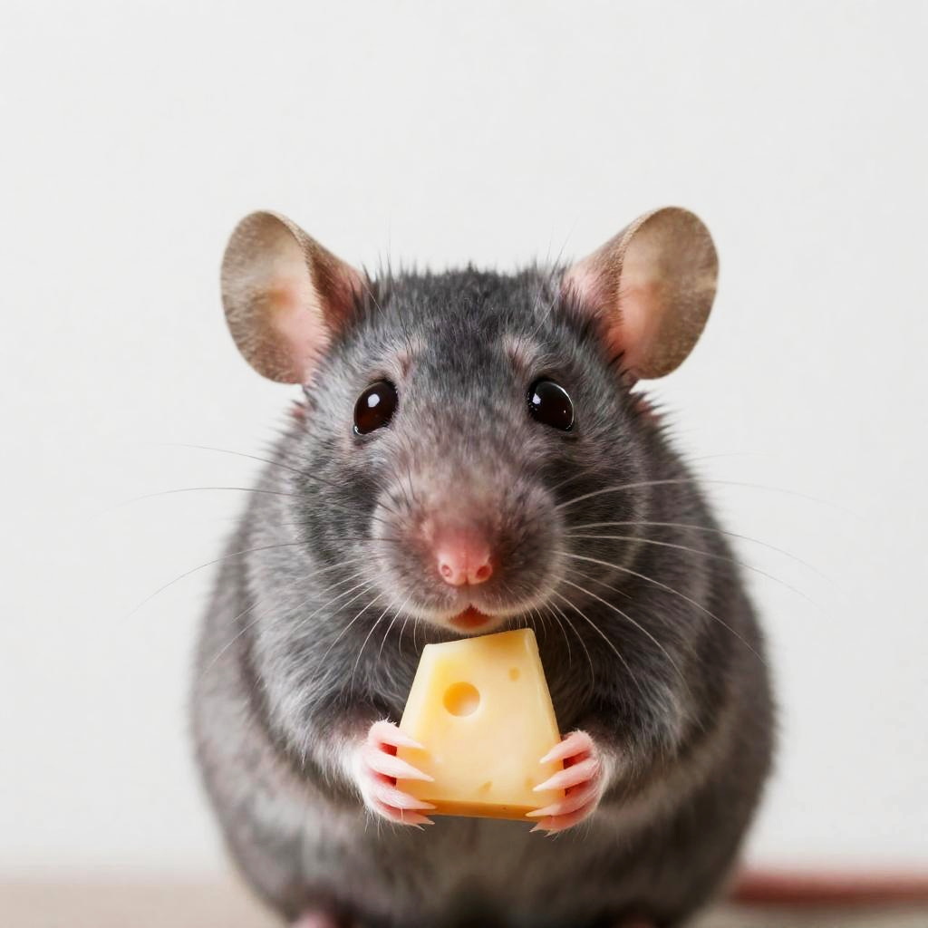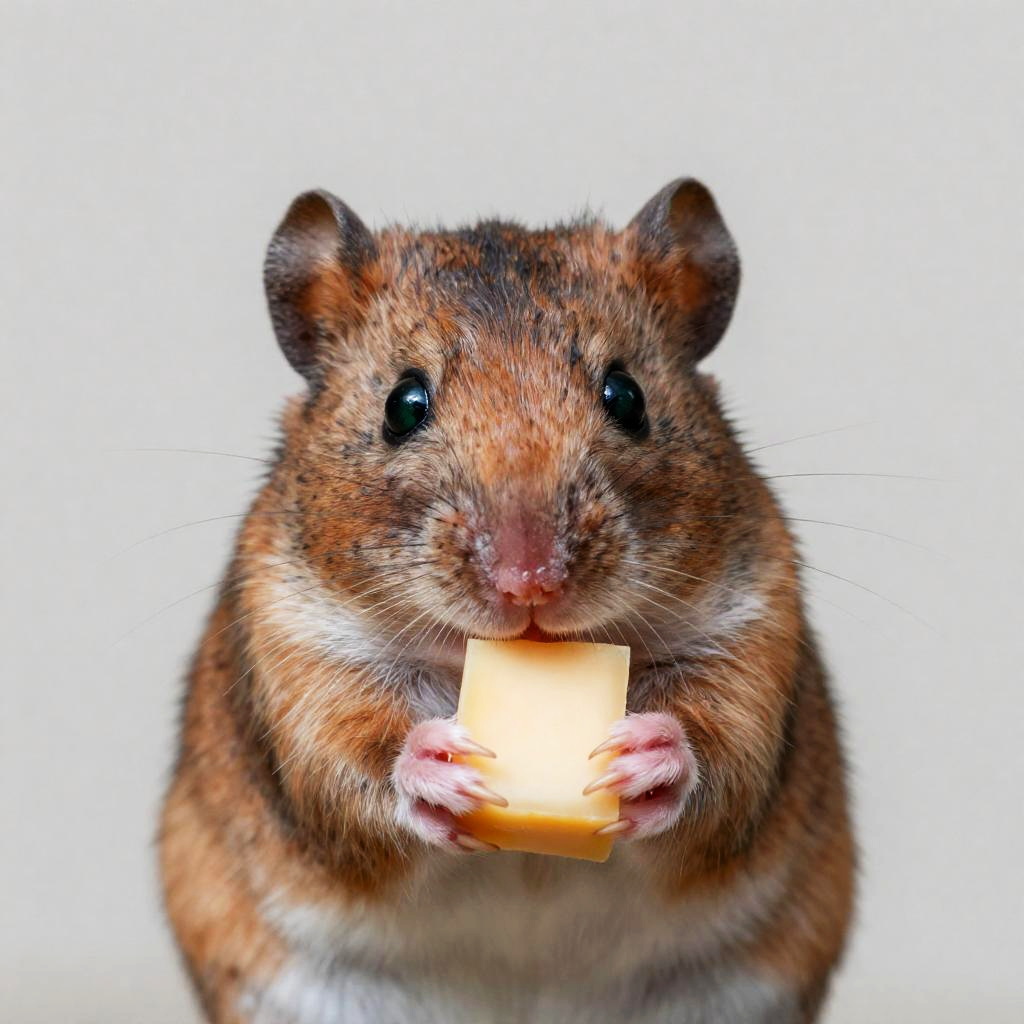 Upper body, solo, tiny field mouse with soft tawny fur, delicate whiskers and round pink ears, holding cheese, looking at viewer, bright green eyes, closed mouth, straight-on, simple background