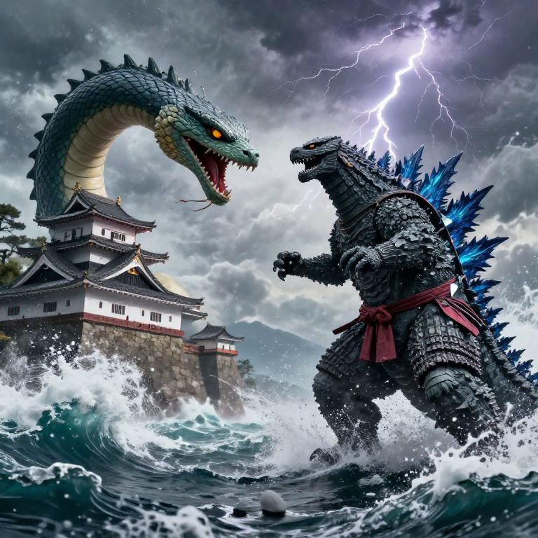Digital artwork of Godzilla battling a dragon-like sea monster near a traditional Japanese castle, with lightning illuminating the stormy sky.