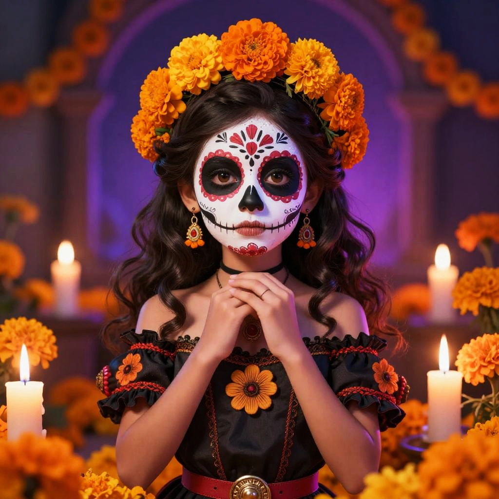 Mexican anime girl with Day of the Dead face paint, surrounded by marigold flowers and candles, mystical and vibrant atmosphere, detailed costume and background, delicate yet vivid anime art