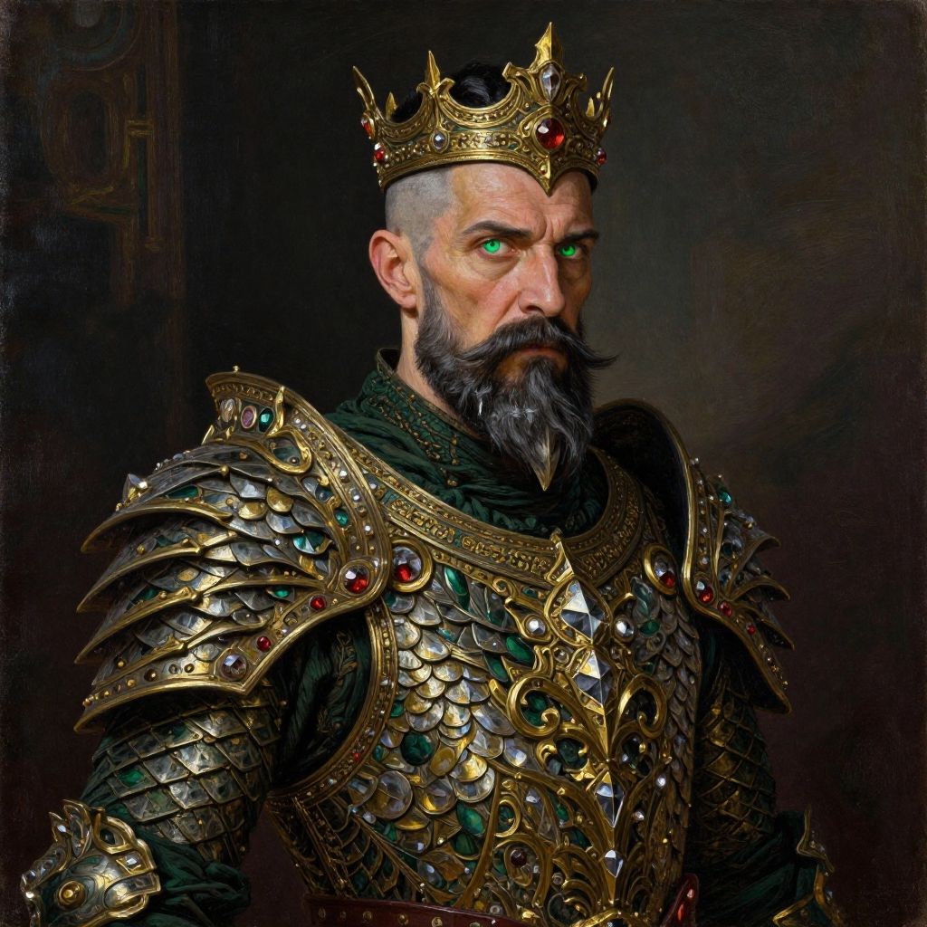 Digital painting of a stern, bearded king with green eyes, wearing an ornate gold crown, and elaborate armor adorned with red gems.