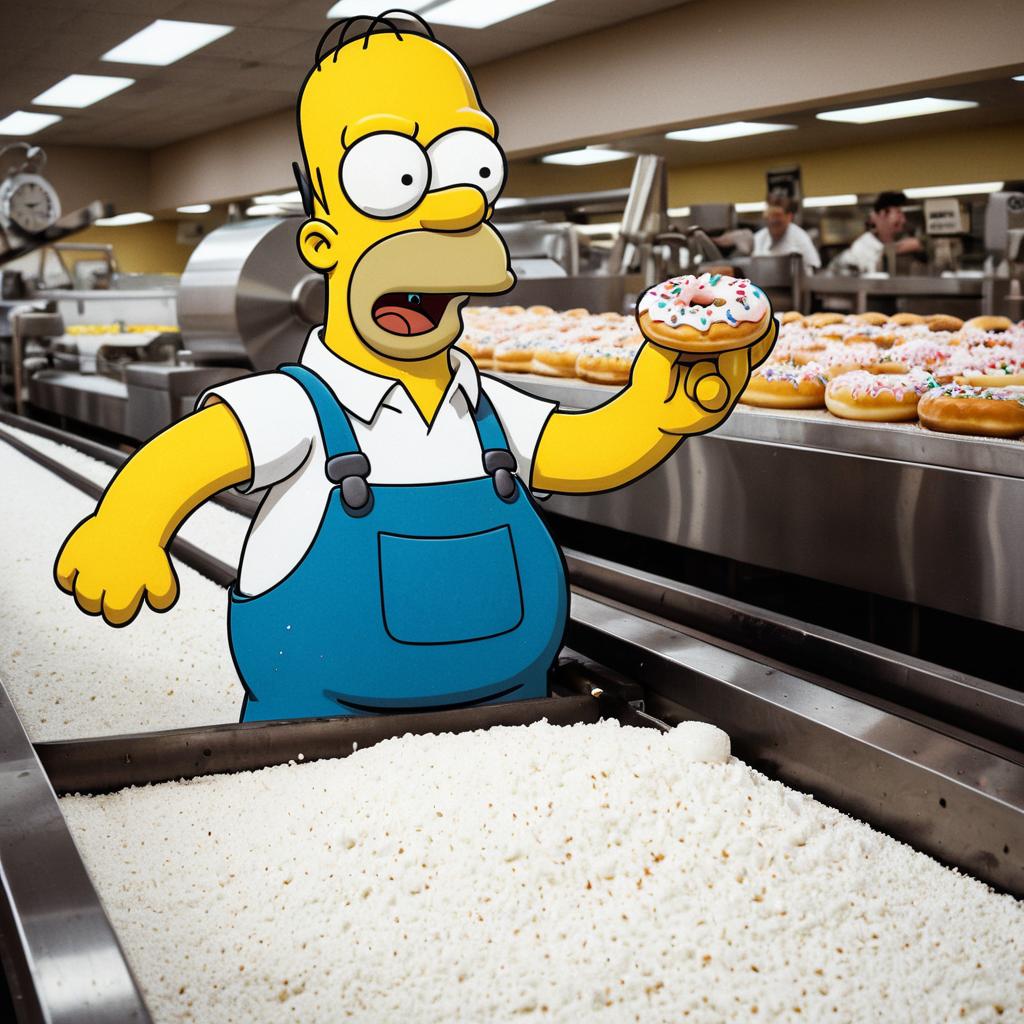 Homer Simpson in classic cartoon style, with a confounded grimace on his face. Surrounded by a busy donut factory with conveyor belts and icing spills. His low IQ is emphasized with over-sized buzzwords floating as bubbles and a sad clock showing morning time around him, creating a humorous and playful portrayal that highlights his mischievous and clueless nature.