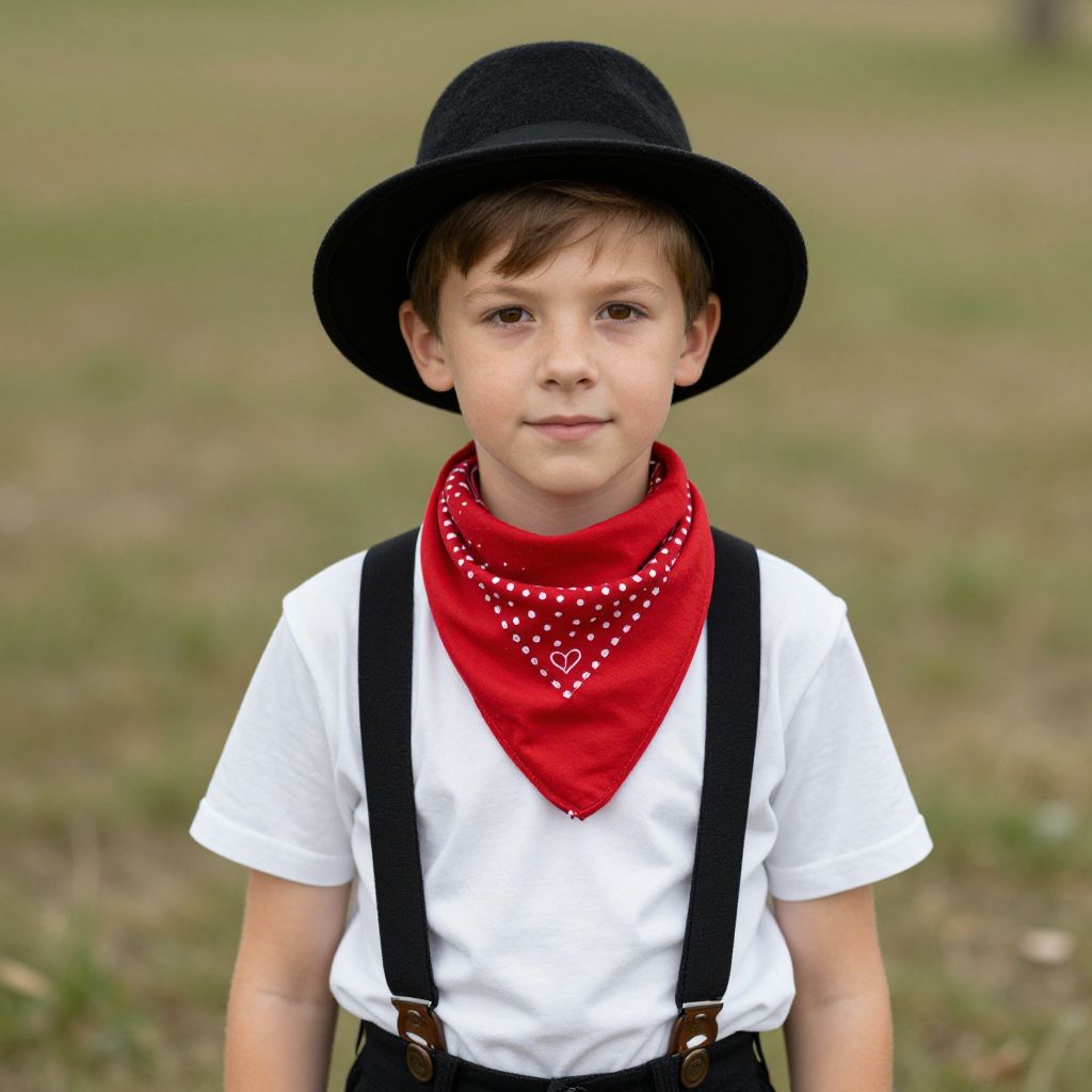 Red Bandana Costume, boy wearing a red bandana and black suspenders and a hat