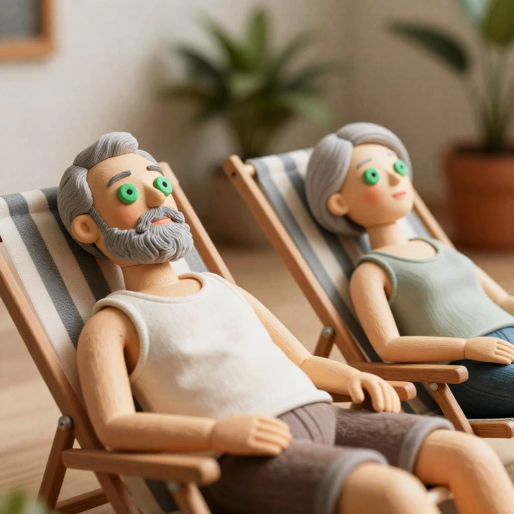 Photograph of two elderly, sculpted figures with green, circular eyes. Both wear tank tops; man has grey beard, woman has short grey hair. They lie on striped lounge chairs, arms resting on laps. Background includes potted plant, shadowed wall.