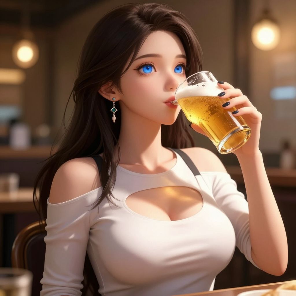 Digital artwork of an attractive Asian woman with long black hair, sipping beer in a cozy café, wearing a white blouse.