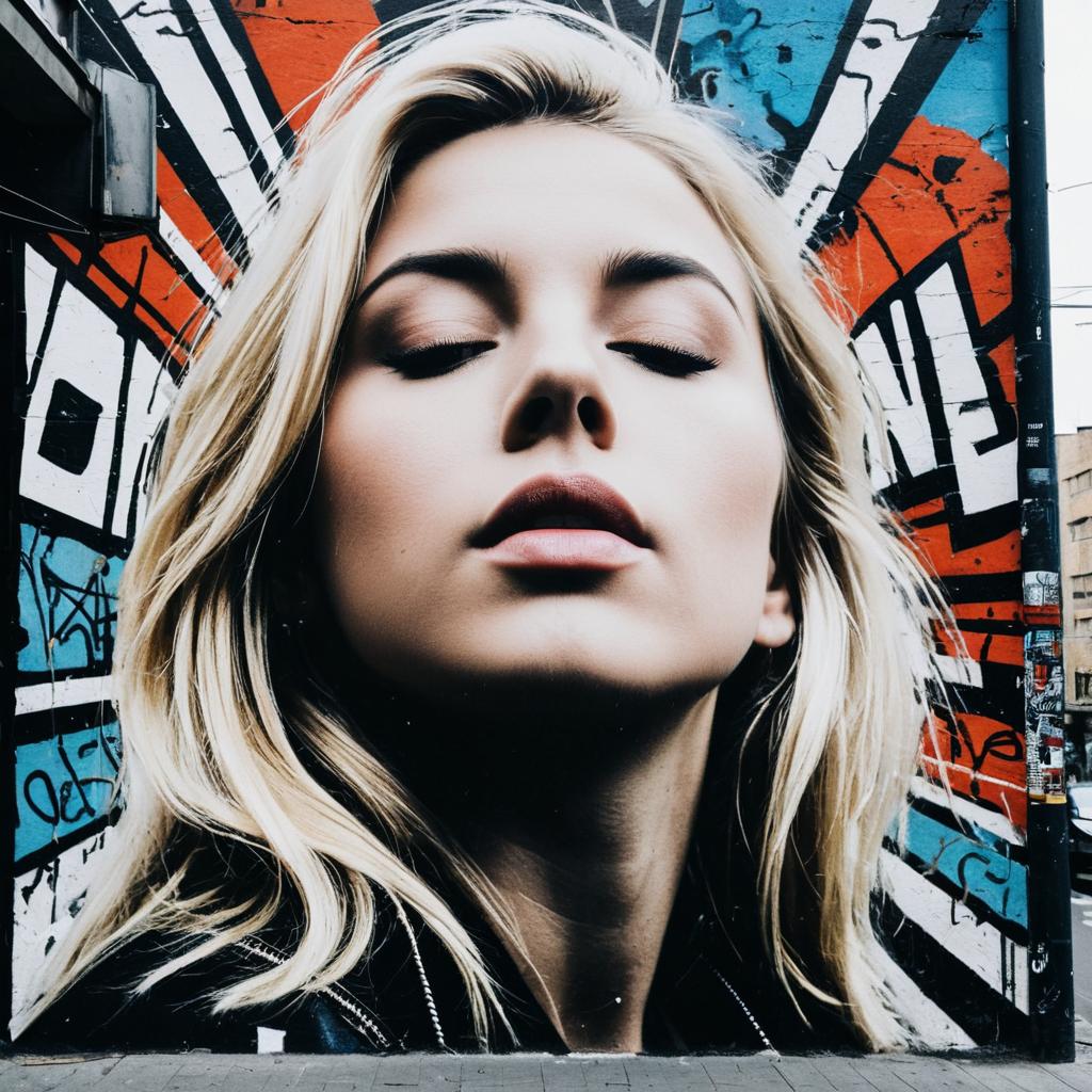 Realistic photo.a girl with blonde hair, eyes closed, in the style of street art, bold contrast, with urban landscapes, using experimental collage
