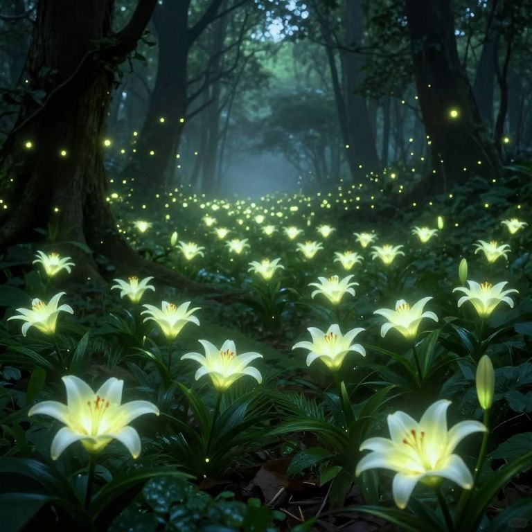 Photograph-style digital art of a mystical forest at night, glowing white lilies illuminating the path, surrounded by floating fireflies.