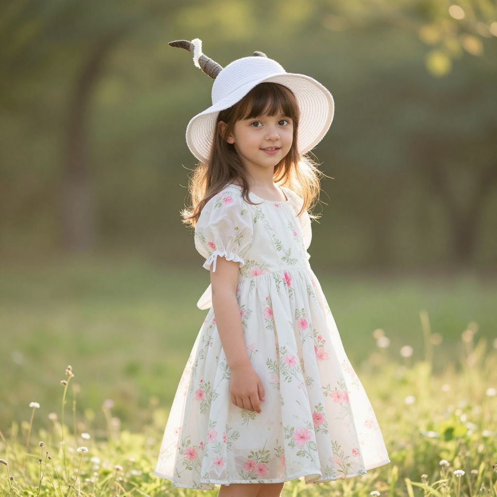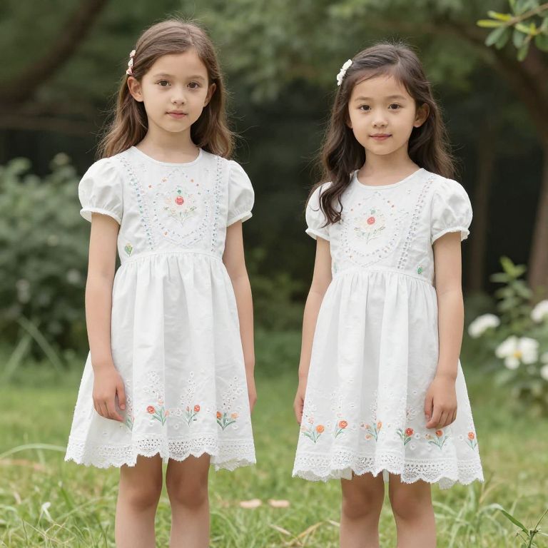 Photograph of two young Asian girls with long black hair, wearing white embroidered dresses, standing in a grassy outdoor setting.