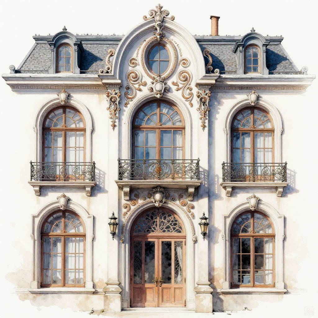 Architectural composition of an ornate classical building facade featuring large arched windows, decorative wrought iron balconies, intricate stucco detailing, and a mansard roof with dormer windows. The facade has a balanced symmetrical design with a central entrance door framed by elaborate scrollwork.