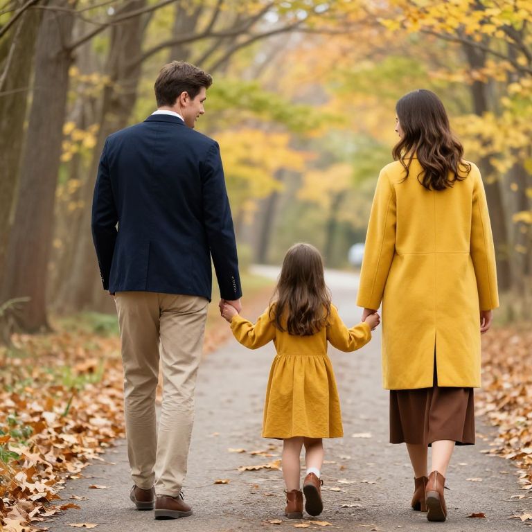 Photograph of a family walking on a paved path through a forest in autumn. The father, in a navy blazer, beige pants, and brown shoes, holds hands with the mother in a bright yellow coat and brown skirt. A young girl in a mustard-yellow dress and brown boots walks between them. The ground is covered in fallen leaves, and sunlight filters through the trees.