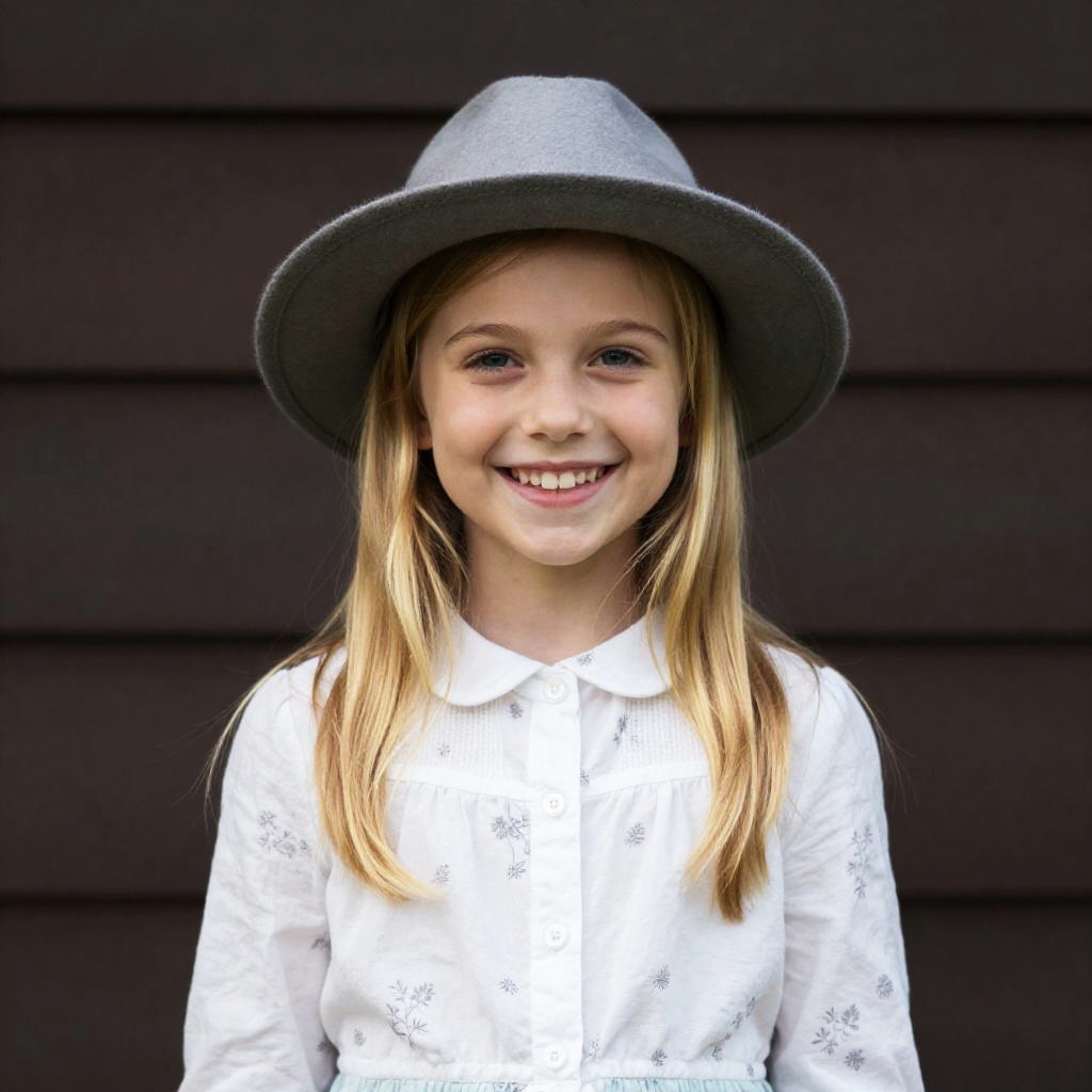 Black-and-white photograph of a young girl with curly blonde hair, wearing an elaborate, floral-patterned dress with ruffles, standing on a spiral staircase with ornate metal railings. She smiles slightly, holding the railing with her right hand. Background includes vertical curtains.