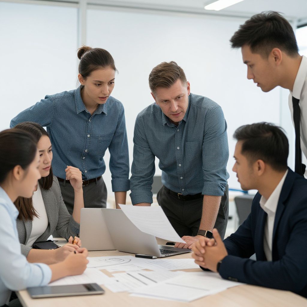 Photograph of five diverse, professionally-dressed colleagues around a table, intently reviewing papers and a laptop in a bright, modern office.