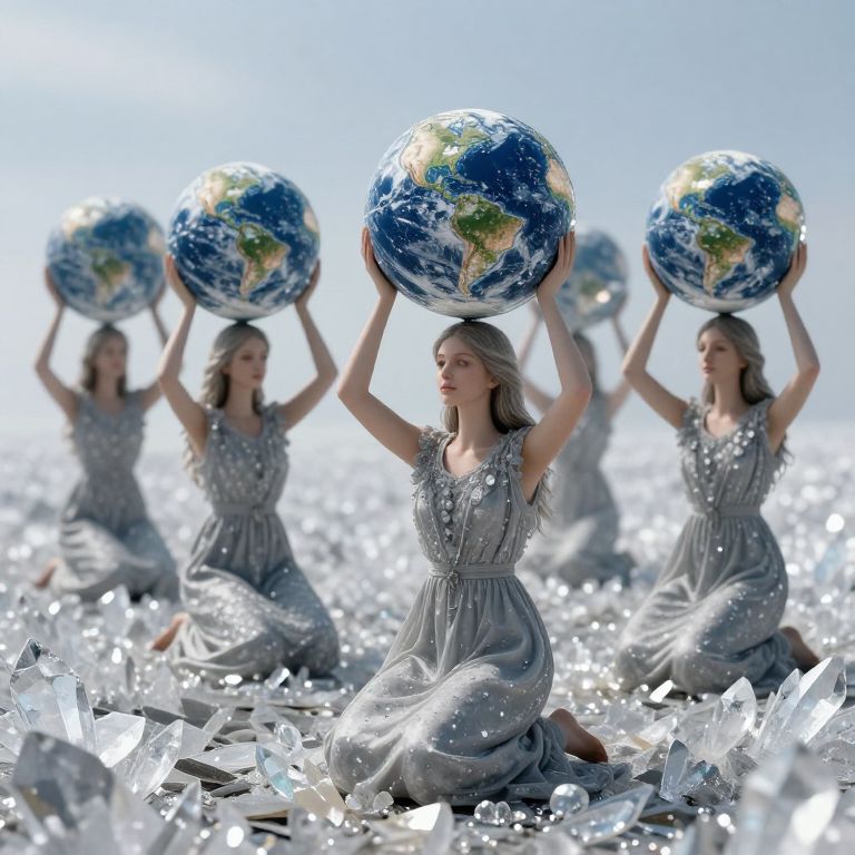 Photograph depicting four women with light skin and blonde hair, kneeling in a sparkling, silver-white field. Each woman wears a sleeveless, silver, embroidered dress and holds a large, spherical Earth above her head. The Earths are vividly colored with blue oceans, green landmasses, and white clouds. The women are evenly spaced in a diagonal line from the foreground to background, with the nearest woman in sharp focus and the background women slightly blurred. The bright, ethereal light emphasizes the reflective, crystalline texture of the field, creating a surreal, otherworldly atmosphere.