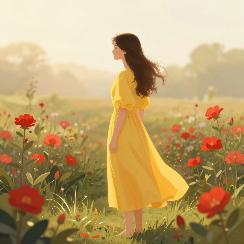 Digital anime-style illustration of a young Asian woman with fair skin, large expressive brown eyes, and long, wavy dark brown hair. She wears a white, short-sleeved, square-neck blouse. She stands amidst a sunlit field of blooming flowers, predominantly pink and orange, with soft, glowing sunlight in the background. The flowers are detailed with delicate petals and green leaves, creating a warm, inviting atmosphere. The woman's gentle expression and soft blush contribute to a serene, dreamlike quality. The overall color palette is warm and sunny, enhancing the peaceful, natural setting.
