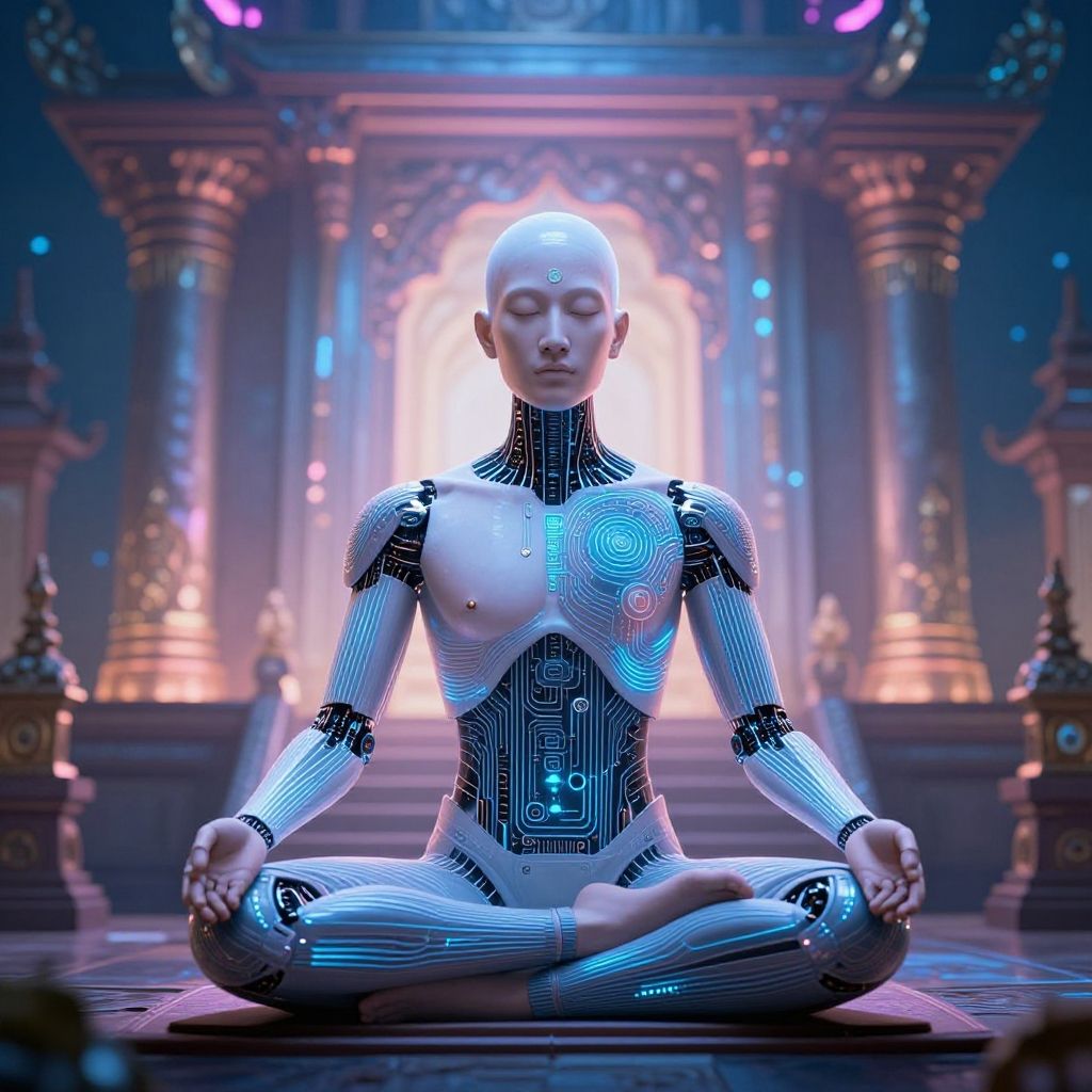 Digital artwork of a bald, white-skinned, robotic humanoid meditating in a futuristic, illuminated temple with neon blue and pink lights.