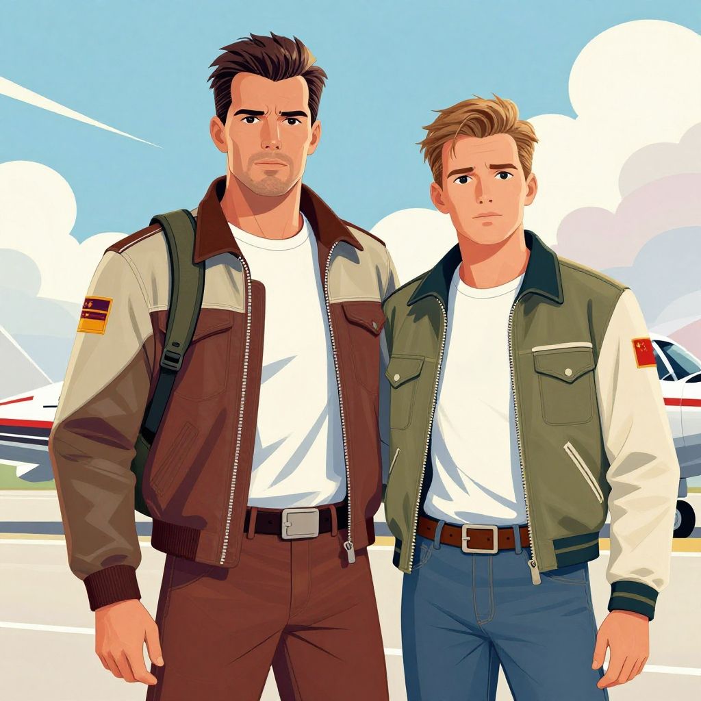 Digital art of two men standing side by side, wearing jackets and jeans, with a plane in the background. One has dark hair, the other blonde