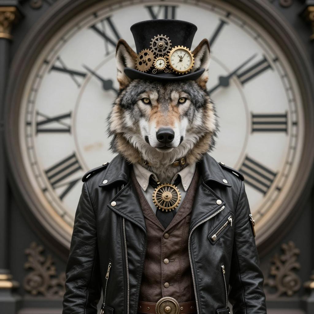 Digital artwork of a wolf dressed in a steampunk style with a black leather jacket and a top hat adorned with clock gears. The wolf stands in front of a large vintage clock face with Roman numerals. The image combines elements of fantasy and steampunk fashion.
