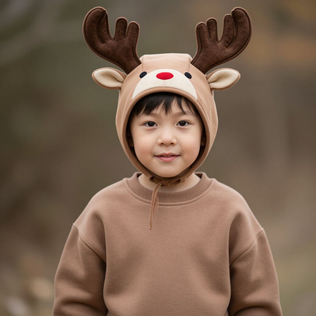 Photograph of an Asian toddler with light skin, black hair, and round face, wearing a brown reindeer-themed hooded sweatshirt with large antlers and a red nose. The background is softly blurred, featuring muted autumn colors. The child is centered, smiling slightly, and the hood covers his head but leaves his face visible. The texture of the sweatshirt is soft and cozy, contrasting with the smooth, slightly shiny texture of the antlers. The overall mood is cute and playful, emphasizing the child's innocent expression and whimsical outfit.