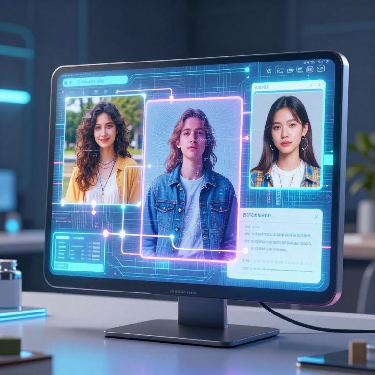 AI to try different hairstyles, expression of creativity and personalization, multiracial young people using advanced AI mirrors, realistic hair strands, glowing UI elements, warm studio lighting emphasizing textures, modern style, vibrant and lively atmosphere