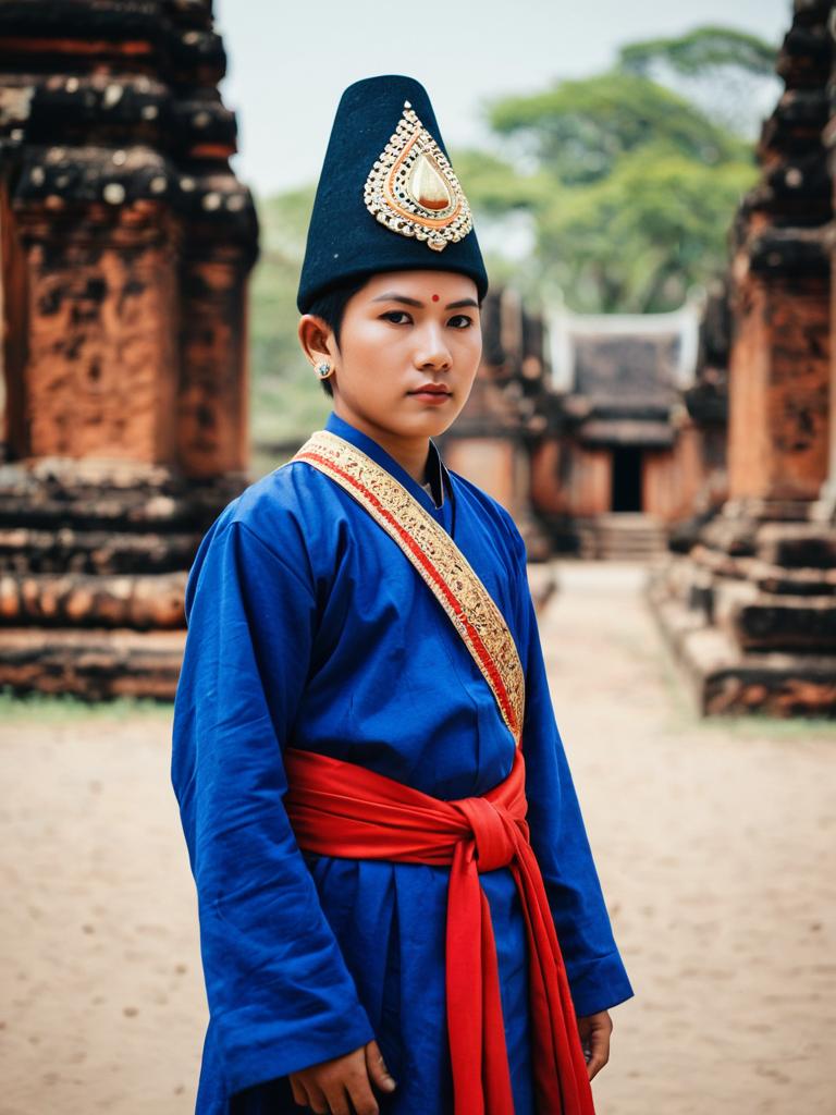 Ayutthaya costume, solo, jewelry, red sash, blue robe, earrings, standing, hat, sash, long sleeves, blurry background, blurry, 1boy, crown, looking at viewer