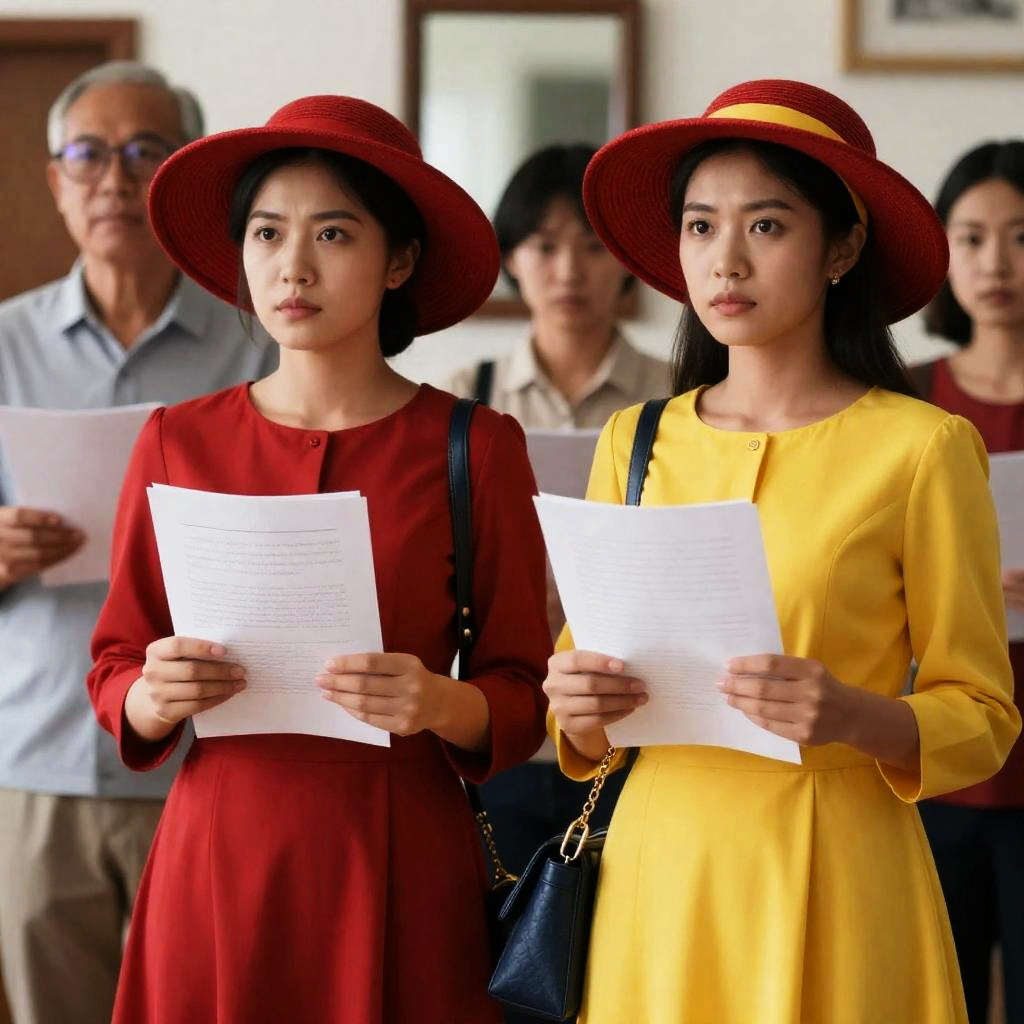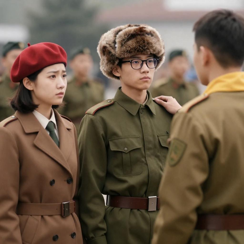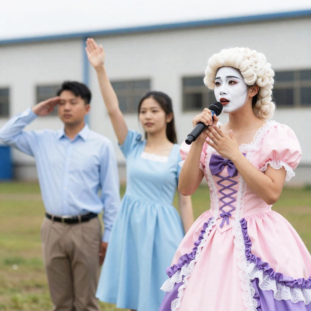 Photograph of three people outdoors. Rightmost person in pink and purple elaborate dress, white wig, holding microphone. Middle person in light blue dress, arm raised. Leftmost person in light blue shirt, brown pants, saluting. Background: industrial building, grass. Rightmost person's intense white face paint contrasts with others' neutral expressions.