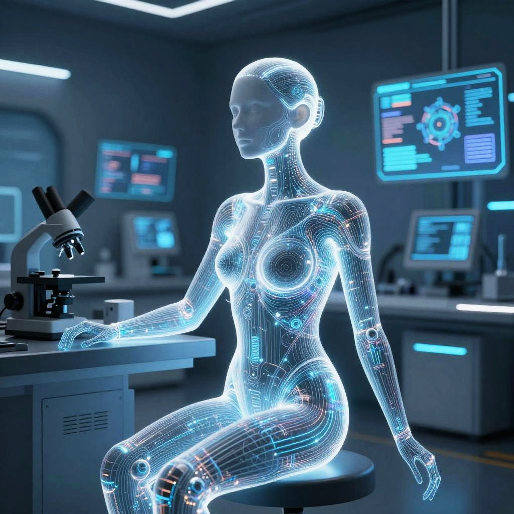 Ailements visualized in a futuristic medical lab with holographic displays of symptoms and DNA strands, neon blue and green lights, high-tech and clinical atmosphere, cinematic lighting