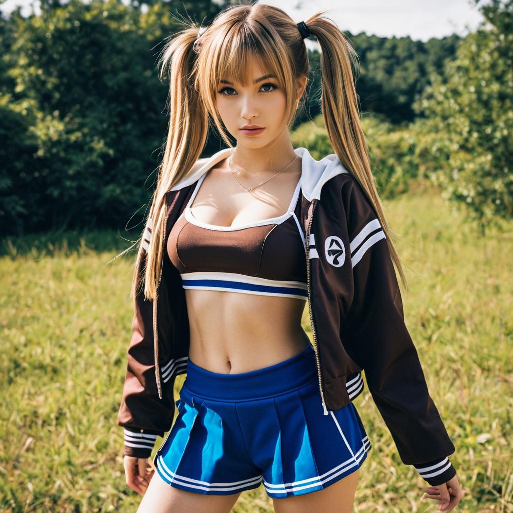 Anime outfit female costume,1girl, solo, navel, midriff, long hair, jacket, realistic, crop top, outdoors, looking at viewer, twintails, skirt, brown hair, blonde hair, brown eyes, breasts, shorts, lips