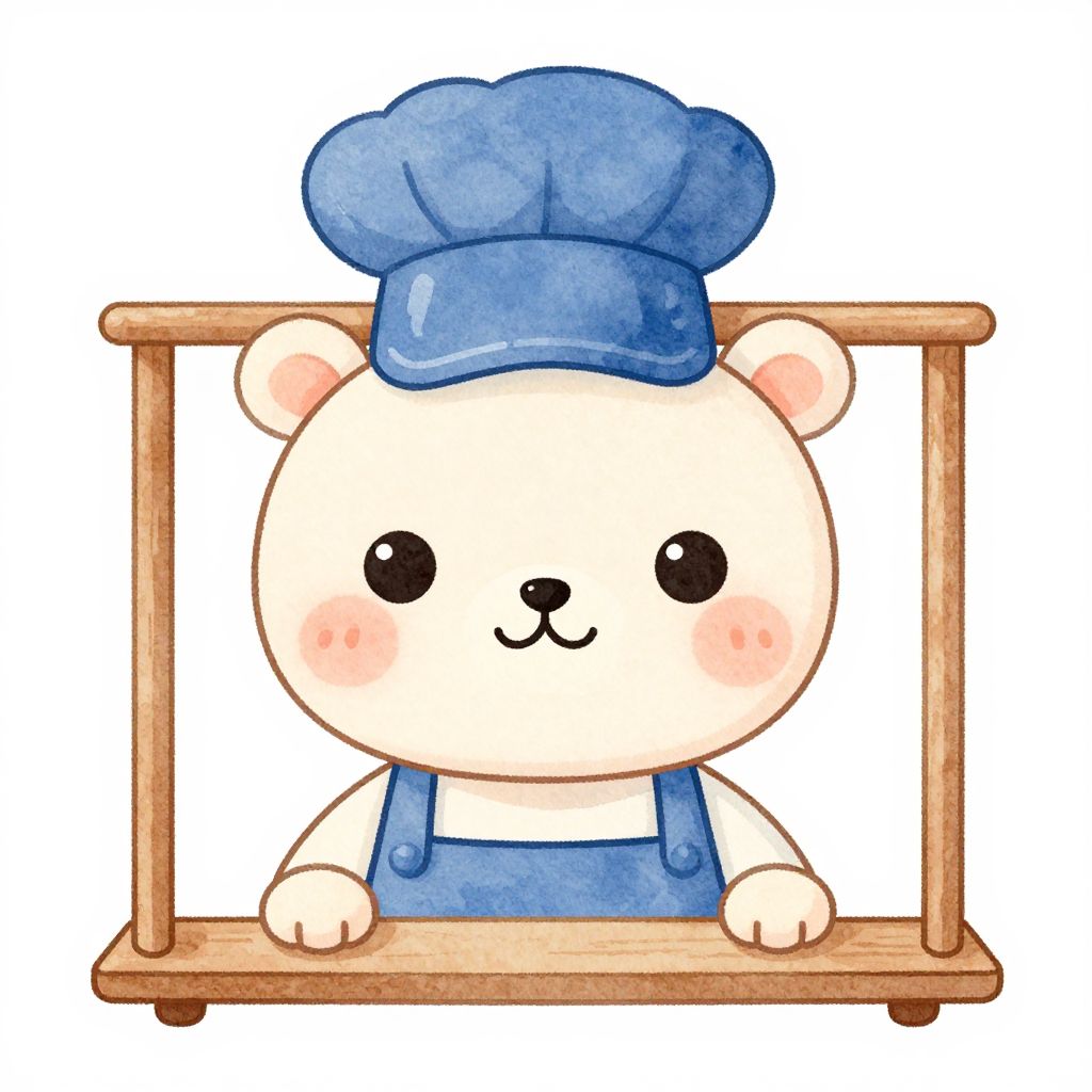 Cute watercolor-style drawing of a white bear wearing a blue chef hat and blue overalls, standing behind a wooden frame.