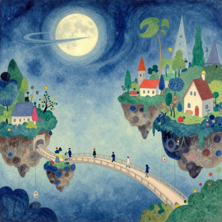 Craft an expansive scene fusing Marc Chagall's dreamlike quality with ukiyo-e print intricacies. This fantastical landscape showcases floating islands tethered by fanciful bridges under the enchanting light of a celestial moon, bathing everything in a soft, ethereal glow. Observe this whimsical world from an unconventional perspective as diminutive creatures navigate through it, embodying a sense of marvel and charm within this harmonious blend of styles.