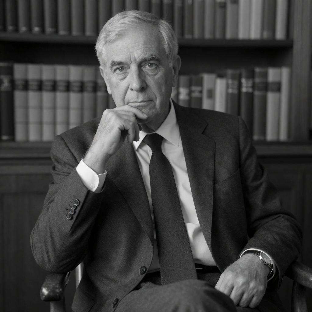 Black-and-white photograph of a middle-aged man in a dark suit, white shirt, and patterned tie, sitting with one leg raised on a concrete step. He has short, light-colored hair and a serious expression. A fern plant is in the background to the left, and a wall is behind him. His right arm is raised, and his left hand rests on his knee.
