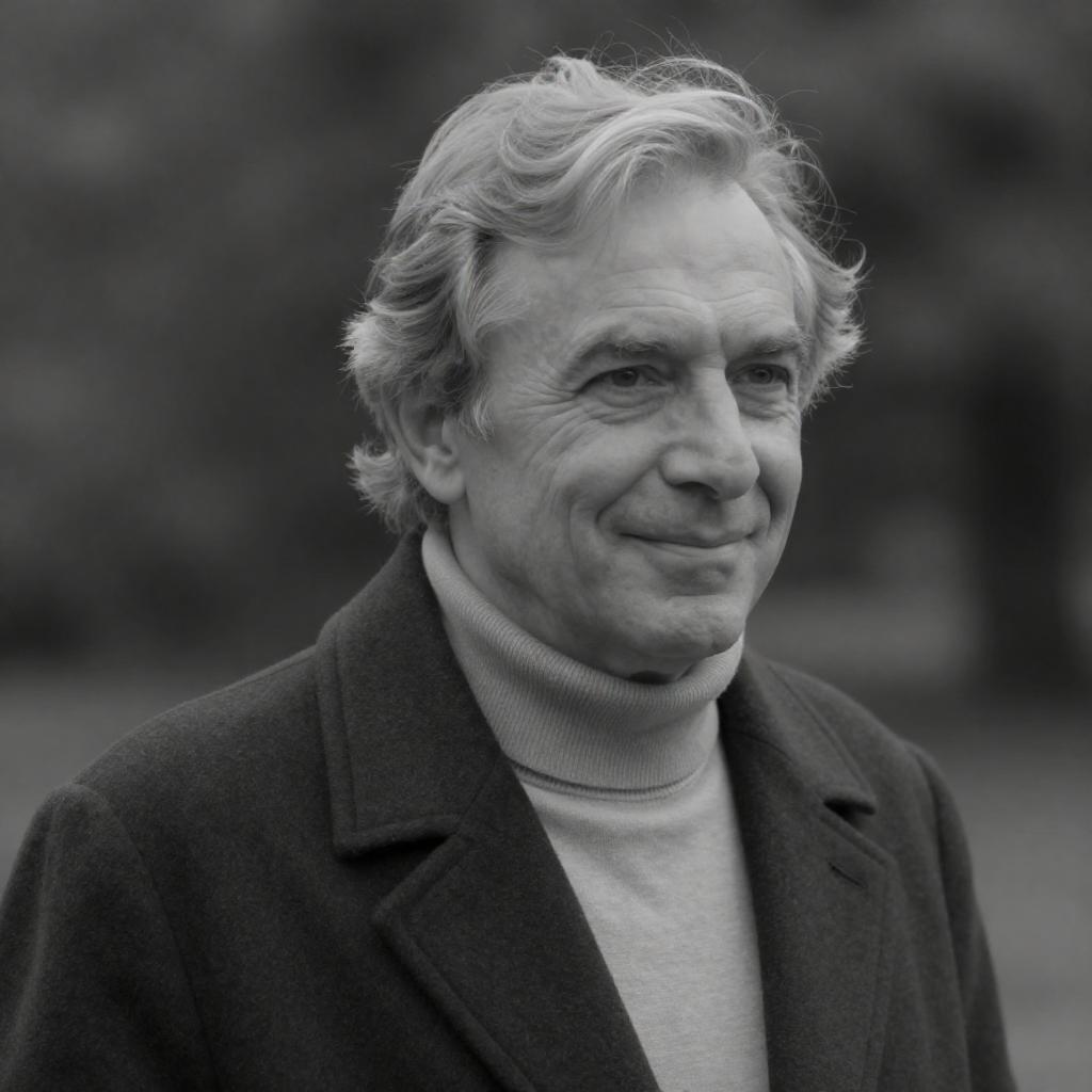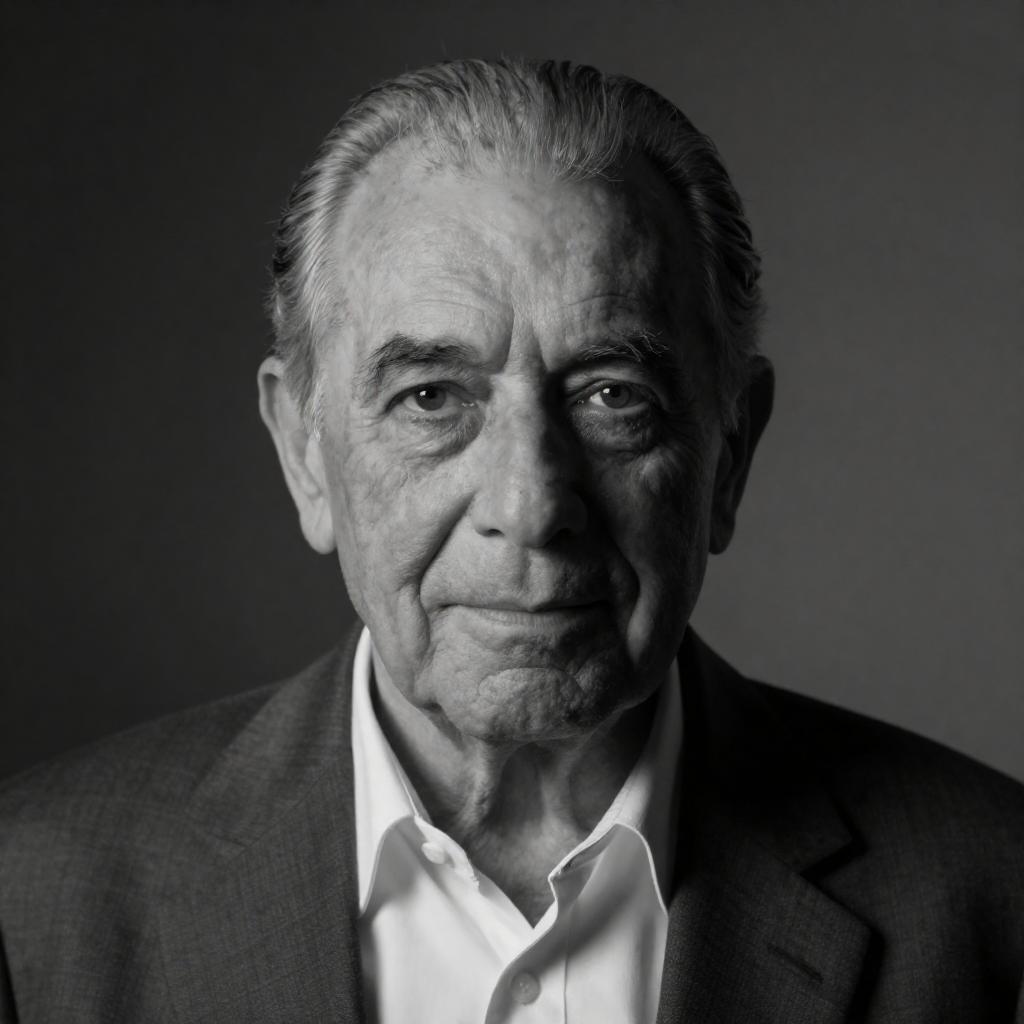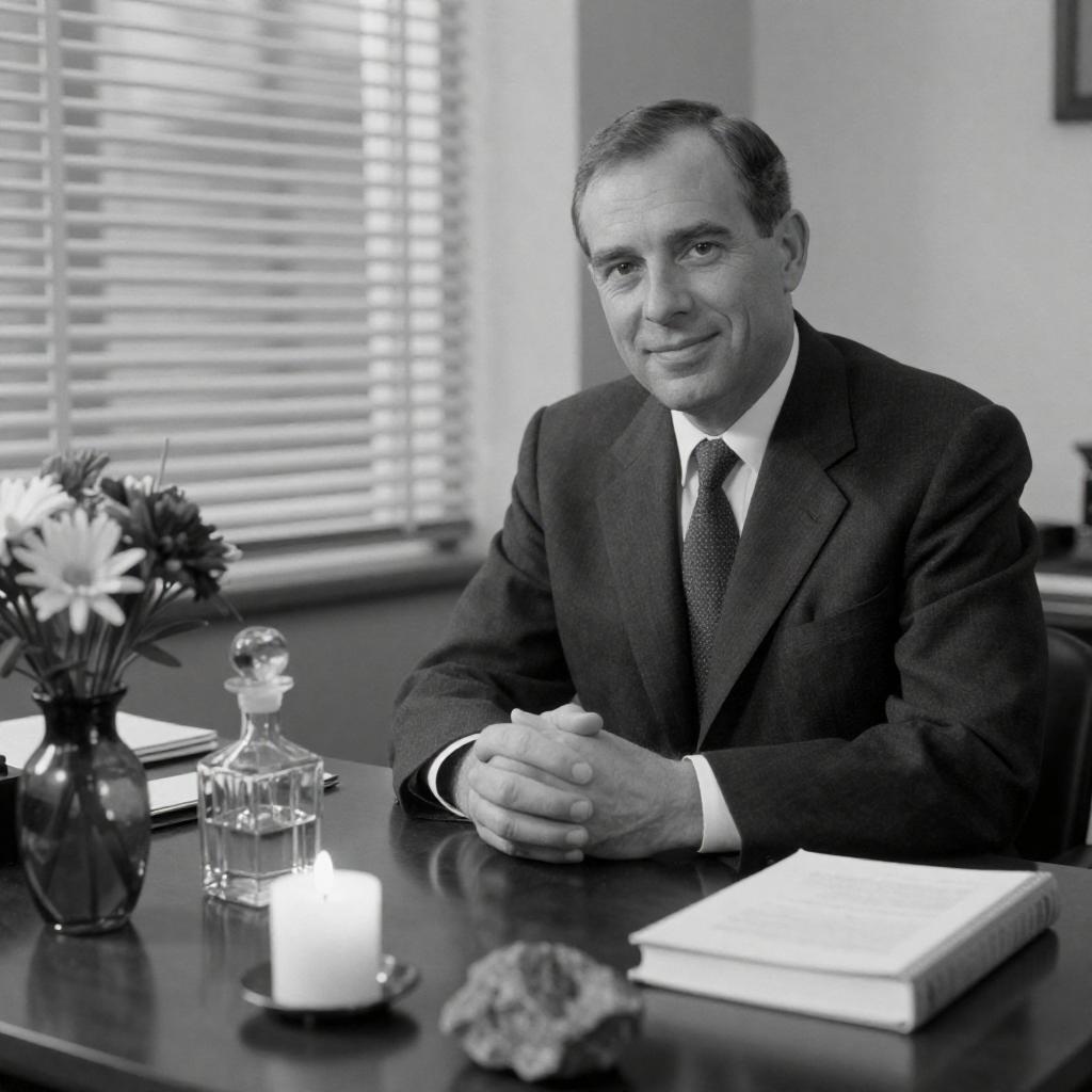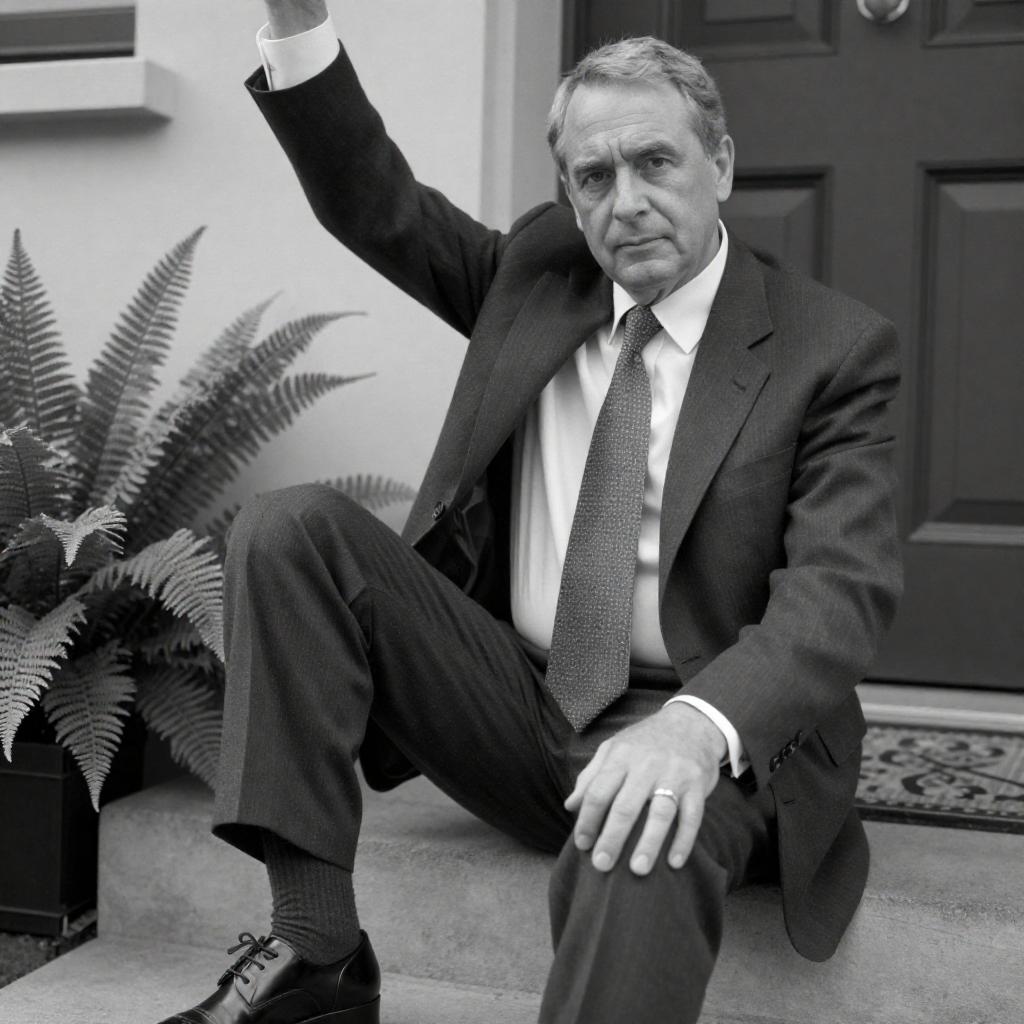 Black-and-white photograph of a middle-aged man in a dark suit, white dress shirt, and patterned tie. He is seated on concrete steps with one leg raised, his right arm lifted, and his left hand resting on his knee. The man has short, light-colored hair and a serious expression. A potted fern plant is visible in the background next to a paneled door.