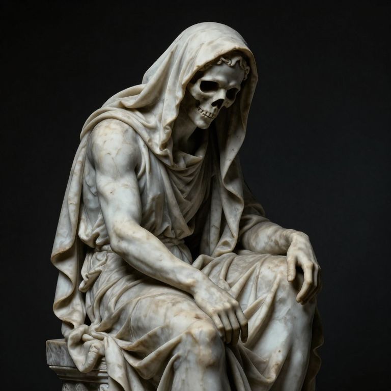 The image depicts a haunting marble statue of the Grim Reaper, characterized by a lifeless skull adorned with a veil that drapes over its form, creating a sense of mystery and eeriness. The statue is rendered in a dark, moonlit style reminiscent of Michelangelo's work, with a focus on dramatic lighting that accentuates the textures and contours of the marble. The figure's posture is hunched and contemplative, with hands resting on its lap, adding to the overall sense of melancholy and contemplation. The background is a deep, dark shade, which contrasts sharply with the lighter tones of the marble, further emphasizing the statue's presence and the somber mood of the scene. The interplay of light and shadow, along with the intricate details of the marble, contribute to a powerful and evocative visual experience.