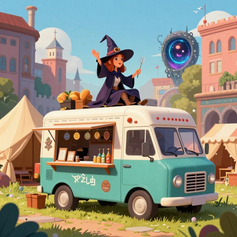 A whimsical, colorful food truck with a witch spellcaster in a whimsical, urban fantasy setting, surrounded by tents and a portal to another world.