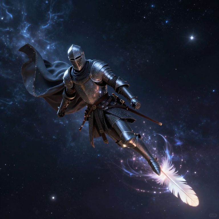 A medieval knight clad in armor and a flowing cloak of stardust soars through a cosmic expanse, propelled by a luminous feather that defies gravity and bends spacetime, rendered in a high-definition digital art style with dramatic lighting and celestial visual effects.