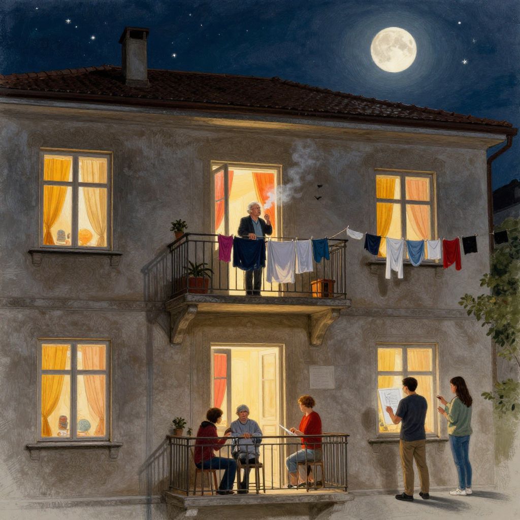 This digital illustration depicts a nighttime scene of a two-story stone house with warm, yellow-lit windows. A full moon illuminates the dark blue sky. On the balcony, a man in a dark suit smokes a cigarette. Below, four people sit and stand on the lower balcony, chatting. Colorful clothes hang on a clothesline between the balconies. The windows have orange curtains, and a small potted plant is on the upper balcony. The textures of the stone wall and wooden balcony railings are detailed. A starry sky and tree on the right complete the scene.