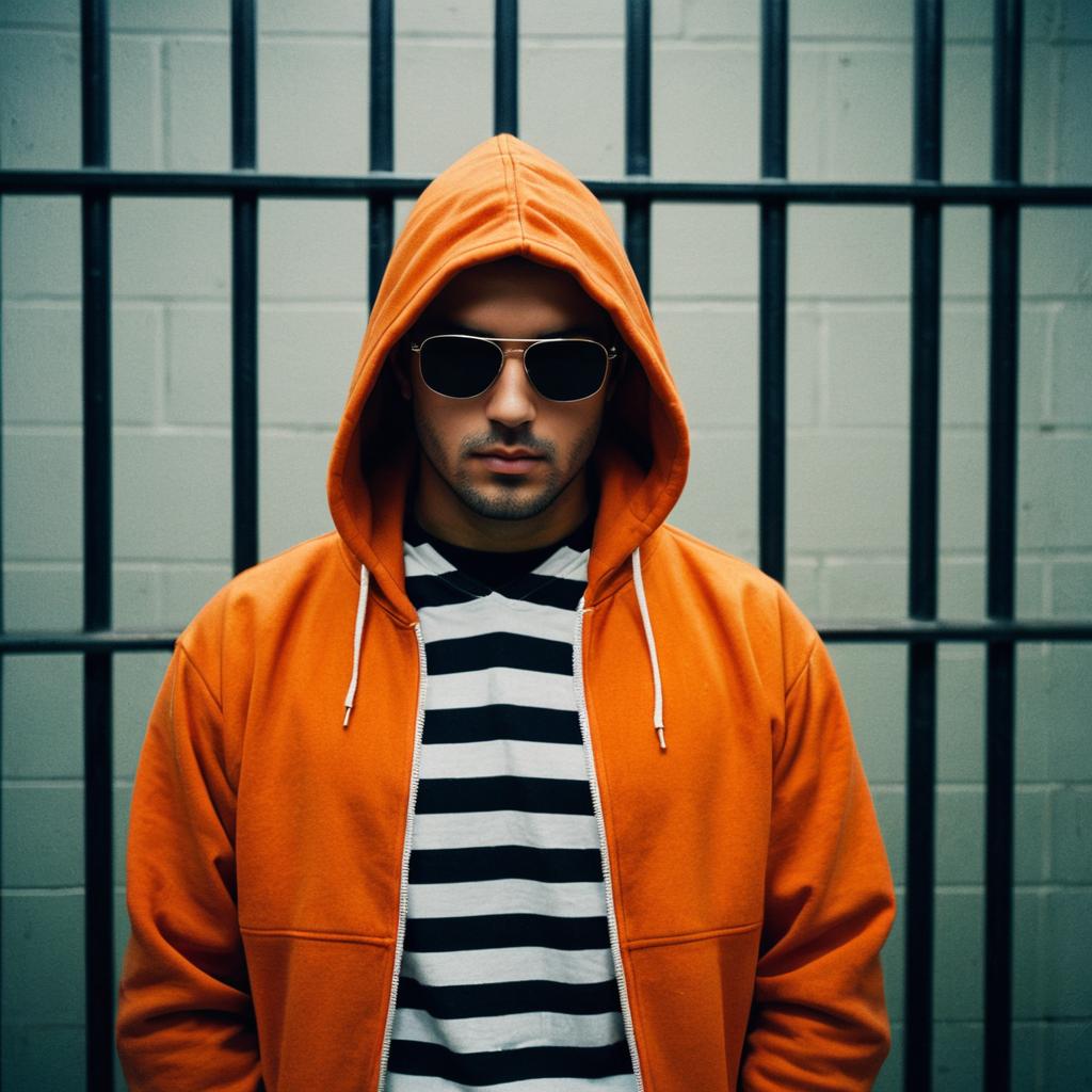Jailbird costume orange,1boy, male focus, solo, prison clothes, hood, sunglasses, hoodie, striped clothes, hood up