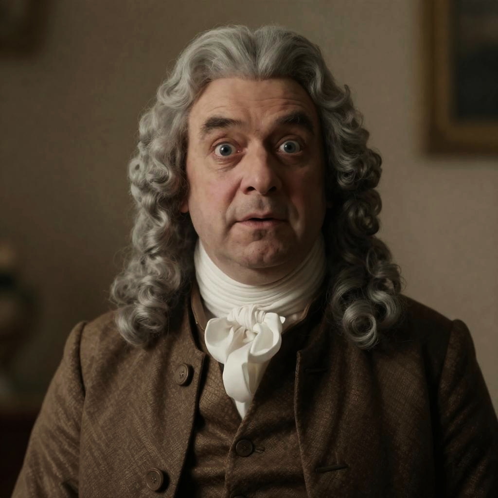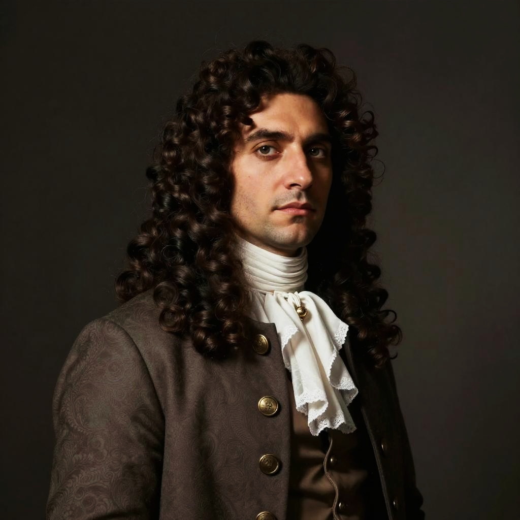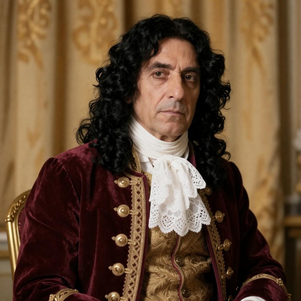Old man with long, curly black hair, wearing a rich burgundy velvet jacket with intricate gold embroidery and a white lace cravat. Golden, patterned curtains in the background. He has a serious expression. Sitting slightly angled to the right. Photographic image.