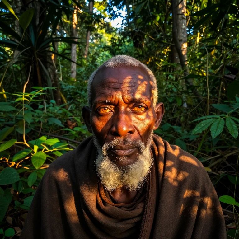 Envision a photorealistic portrait captured by an iPhone's lens, showcasing the enigmatic aura of an African sage with piercing amber eyes and a neatly groomed beard. The warm golden rays of a setting sun penetrate the dense foliage of an ancient forest, casting a soft glow on his weathered countenance as he sits deep in thought. From an unusual overhead perspective, focus on his visage beneath the canopy's lush greenery, where intricate patterns of dappled light and shadow adorn his face. This hyperrealistic portrayal exudes both wisdom and resilience, fostering a profound connection with nature while drawing viewers into the captivating depths of his soul through his expressive gaze.