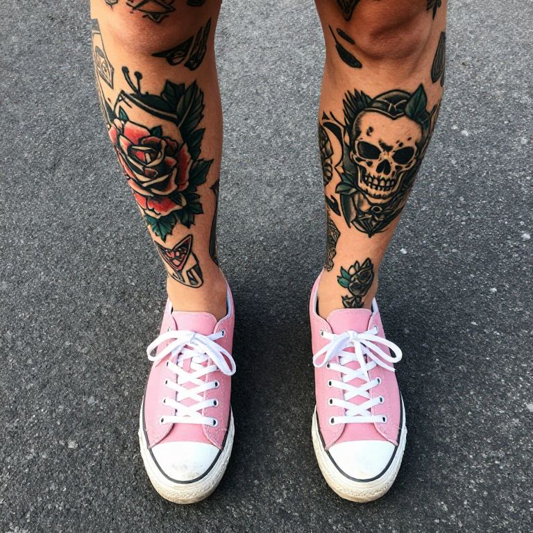 Tattooed legs in pink sneakers with white laces, standing on dark asphalt. Tattoos include skulls, roses, and a dagger. Phot