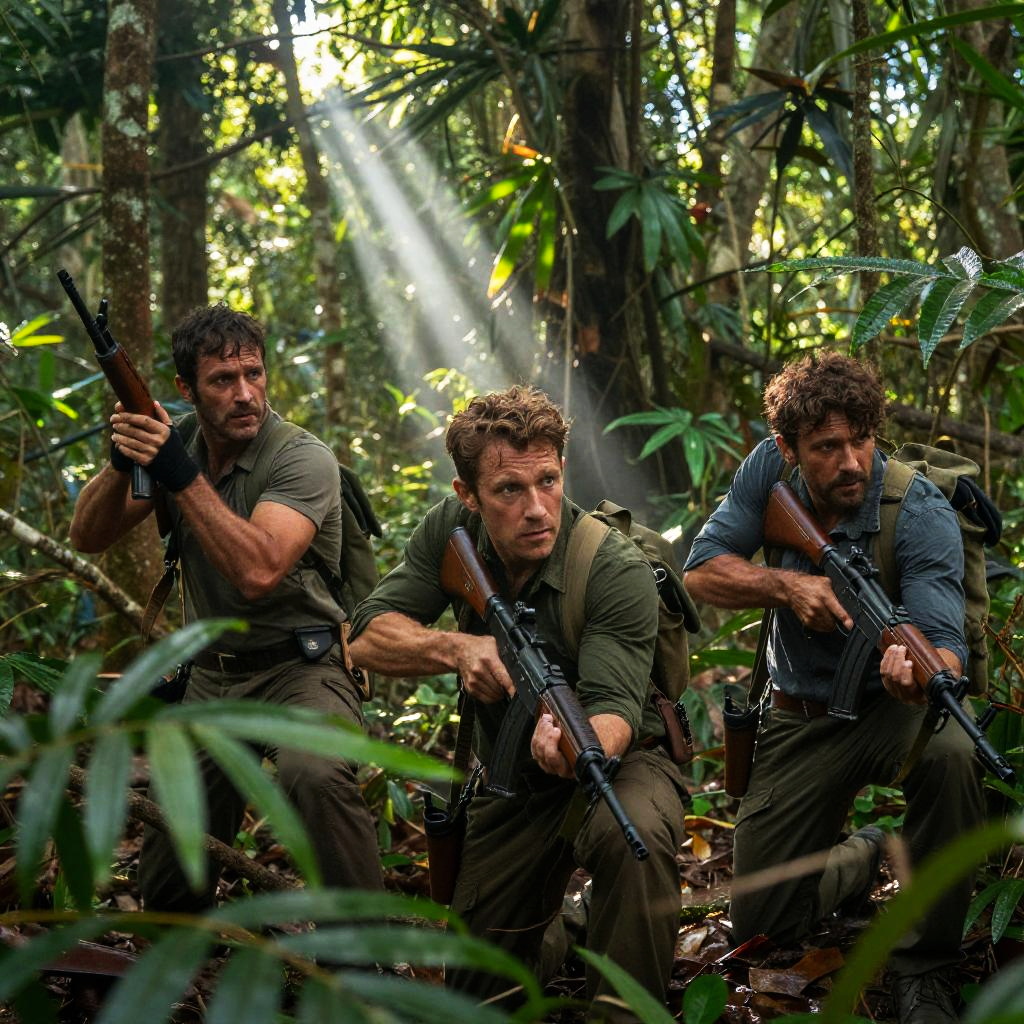 Photograph of three rugged, muscular men with curly brown hair and beards, crouching in a dense, sunlit jungle. They wear olive green and blue shirts, military-style pants, and carry rifles. Sunbeams pierce through the green foliage, creating a dramatic, adventurous atmosphere. The men are focused, with serious expressions, and are positioned in a crouch, moving forward through the underbrush. The background is filled with tall trees, leaves, and shadows, adding depth and realism to the scene. The image conveys a sense of urgency and action.
