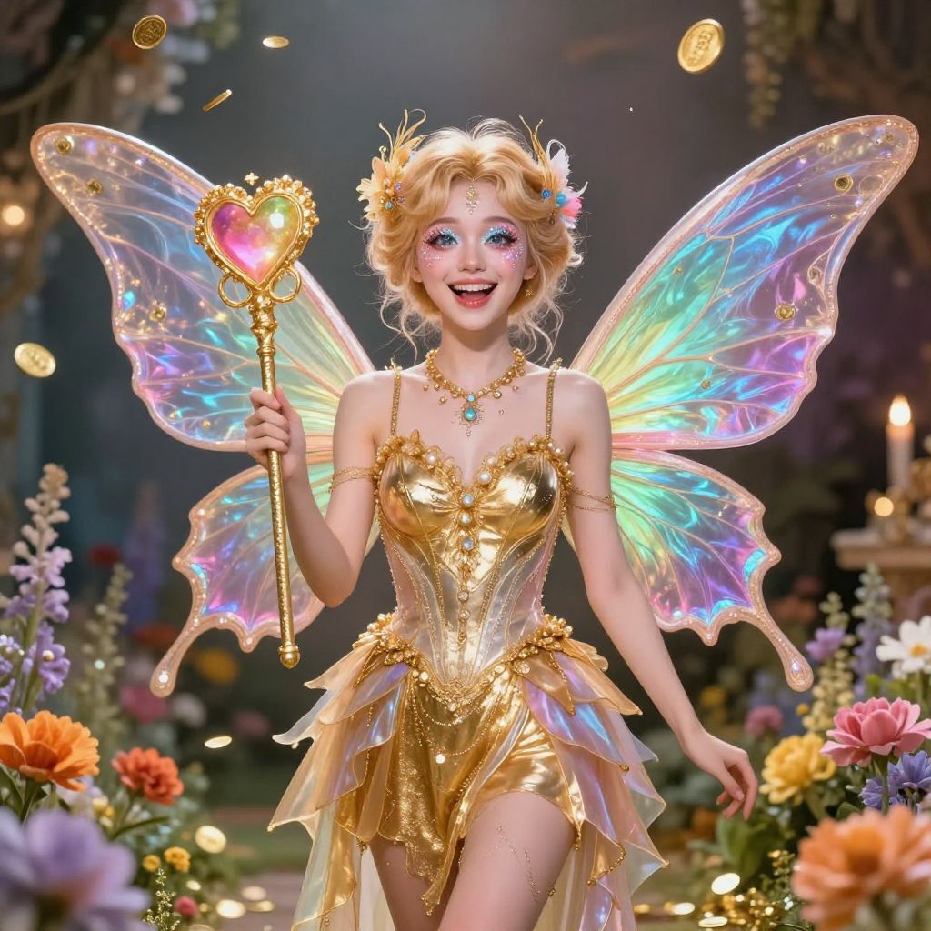 Hyper-realistic digital rendering of an enchanting whimsical fairy with multicolored butterfly wings. The fairy features a joyful expression with shining, intricate eyes and a golden metallic sheen outfit. She holds a vibrant golden heart-shaped wand and stands surrounded by colorful flowers and floating golden coins, creating a magical and celestial atmosphere at a fantasy-themed gala.
