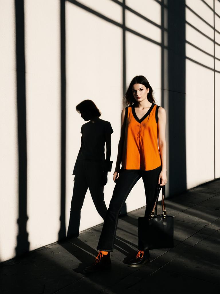 Young woman with long dark hair wearing a sleeveless blouse featuring a small black and gold geometric print, paired with high-waisted dark-wash denim jeans and brown leather lace-up ankle boots. She stands against a dark, moody photo studio background casting a shadow on the wall.