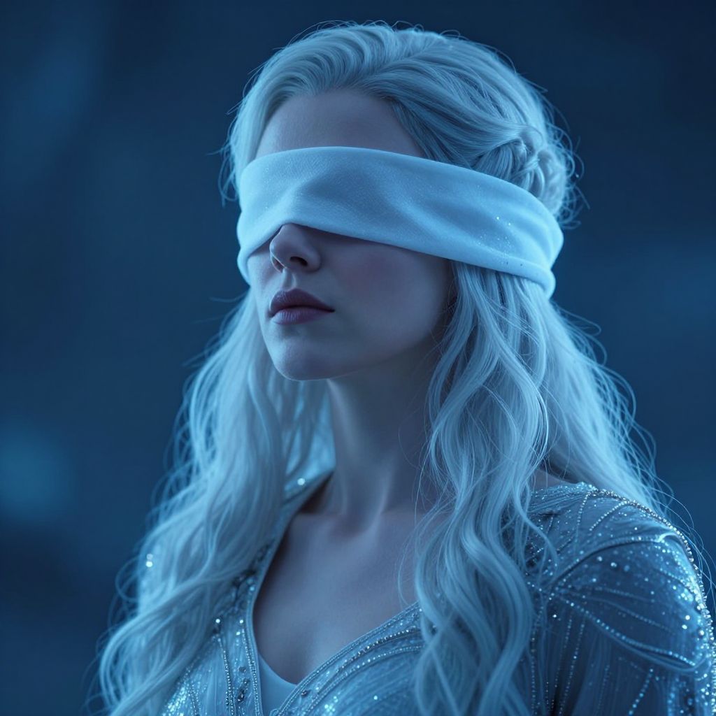 Photograph of a blonde woman with long wavy hair, wearing a white blindfold covering her eyes. She has fair skin and is dressed in a sparkling silver top adorned with sequins. The image is bathed in a blue monochromatic light, giving it a mysterious and ethereal atmosphere. Her lips are slightly parted, and she gazes forward with a neutral expression. The background is dark and indistinct, emphasizing the blue light and her blindfolded state. The texture of her hair appears soft and flowing, contrasting with the shimmering texture of her top.