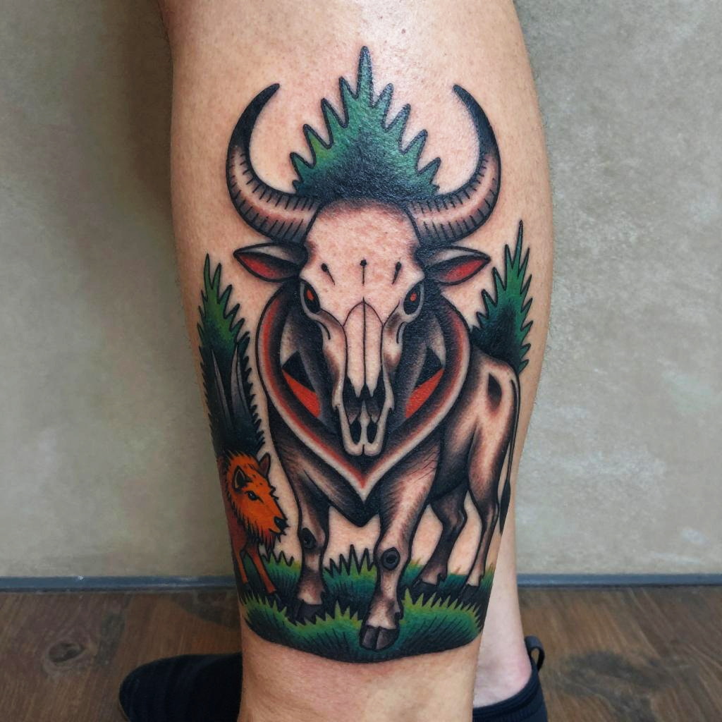 Traditional Slavic Veles tattoo portraying the god of magic and cattle, with symbolic representations of an ox skull and forest creatures, executed in bold black outlines with shaded details, merging mythological and earthy themes on a leg sleeve.