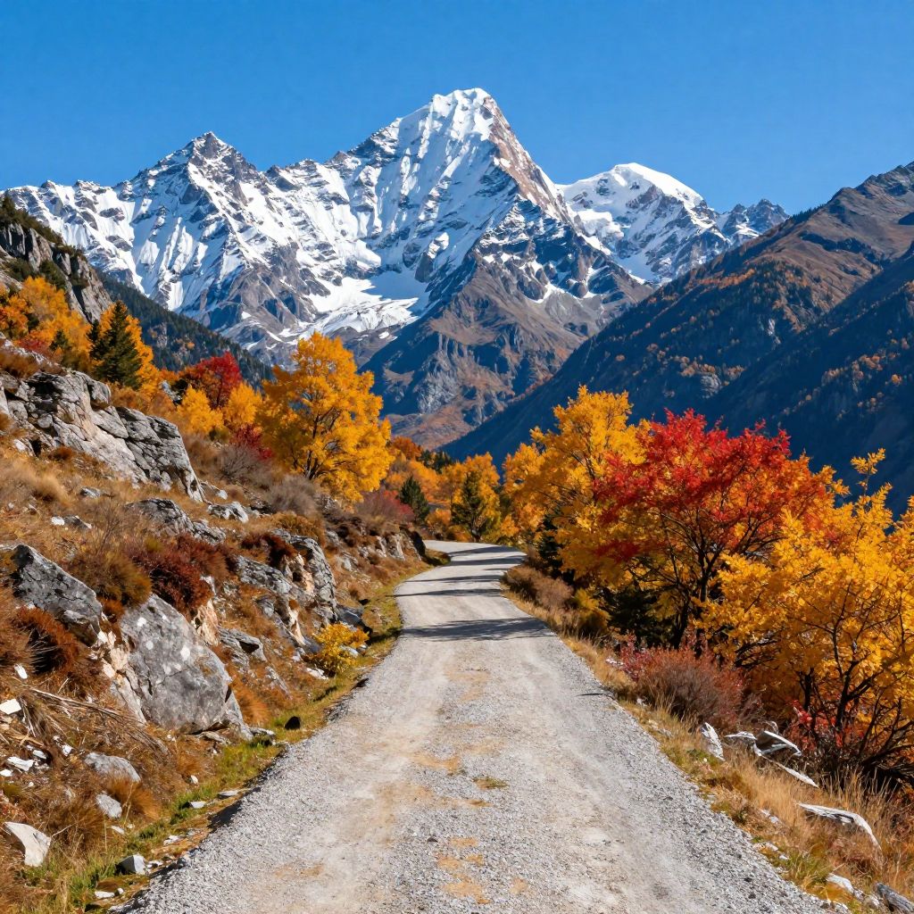 Scenic autumn landscape featuring a winding gravel path flanked by golden and red foliage leading towards towering snow-capped mountains under a clear blue sky. Rocky terrain with sparse vegetation surrounds the path, highlighting the vibrant fall colors.