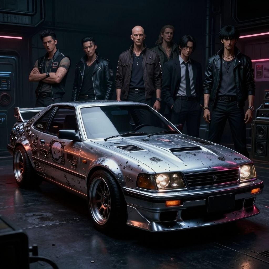 Custom car, 80s and 90s anime style, chrome details, spy gadgets, gritty and dark dystopian cyberpunk world, gangster vibes, sci-fi, high-tech, volumetric lighting, realistic reflections, dark neon, 70mm lens, ray-tracing, art by ghibli, akira, don lawrence, syd mead, moebius, alex ross