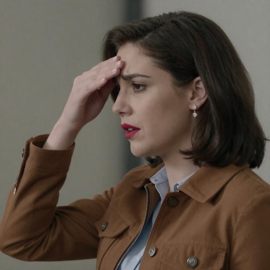 Photograph of a woman with fair skin, dark brown hair, red lipstick, and diamond earrings. She is in profile, raising her right hand to her forehead. She wears a brown jacket over a light blue shirt. Background is blurred. Her expression is focused and slightly concerned.