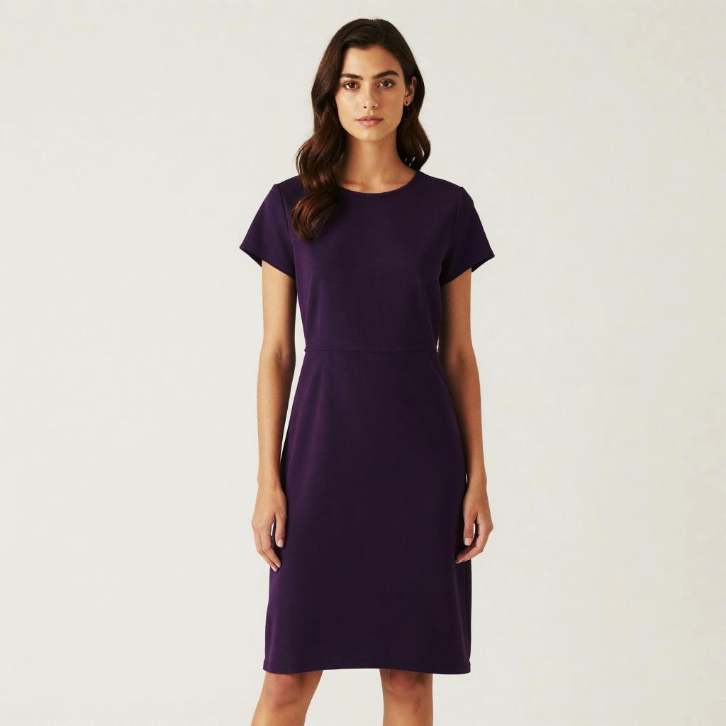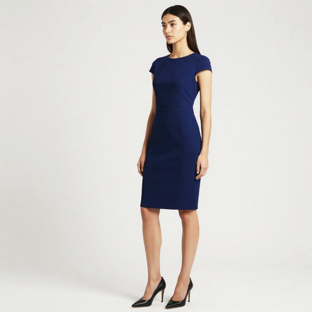Photograph of a blonde woman standing against a white background. She's wearing a short-sleeved, black, V-neck dress that falls just above her knees, and black strappy sandals. Her hair is loose and slightly wavy, and she has a neutral expression. The image has a grey border on both sides, and the lighting is even. She looks relaxed and casual.