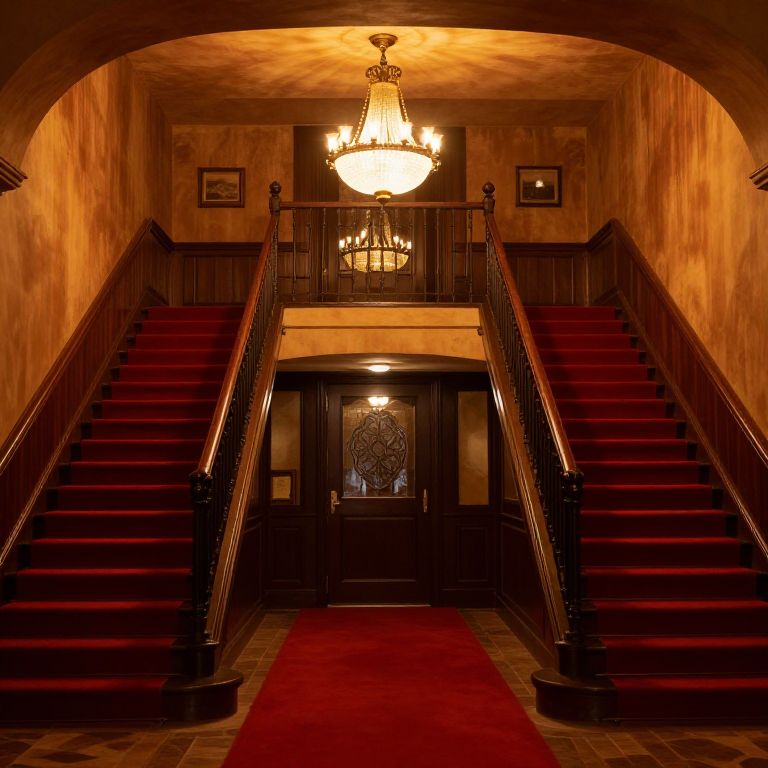 Photograph of a grand, dimly-lit staircase hallway in a luxurious home. The central staircase, with rich, red carpeting, is flanked by dark wooden bannisters. A large, ornate chandelier hangs from the arched ceiling, casting a warm, golden light. The walls are textured with a rustic, beige finish. At the bottom of the stairs, a dark wooden door with an intricate glass design is centered, with two framed pictures on either side. The red carpet extends to the door, contrasting with the stone tile flooring. The overall ambiance is elegant and inviting.